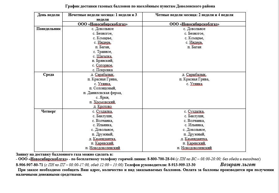 График доставки газовых баллонов по населённым пунктам Доволенского района